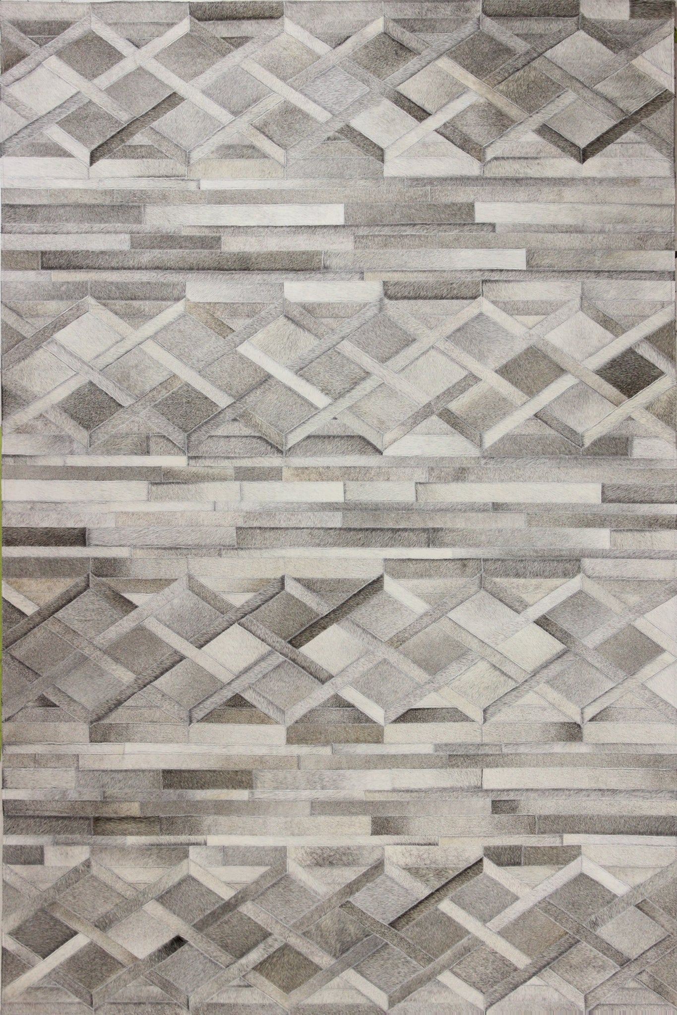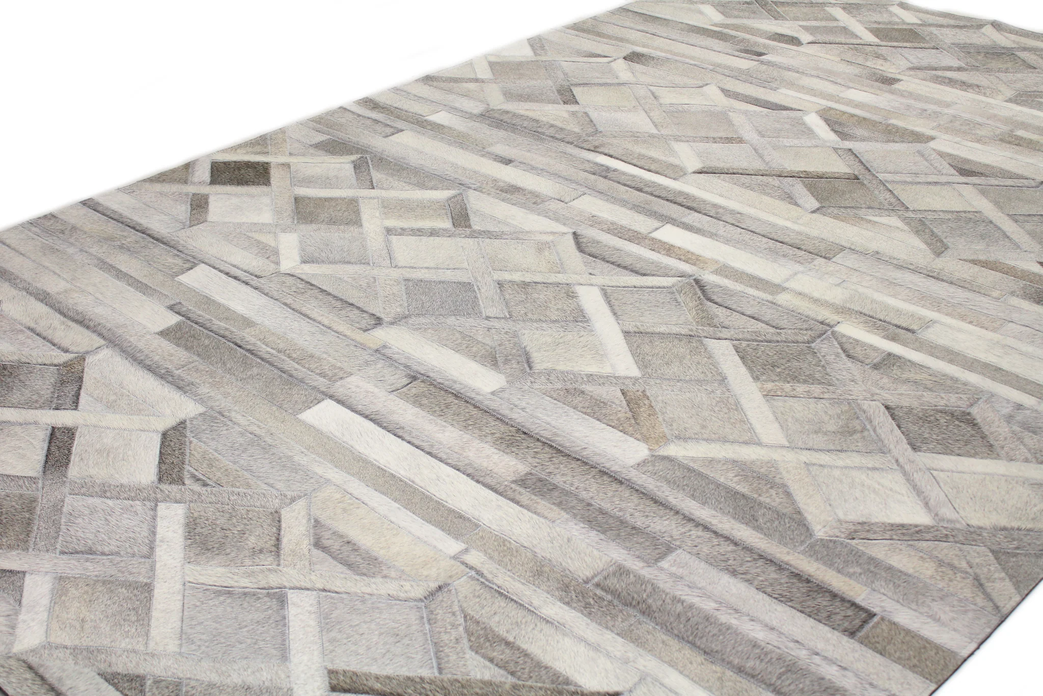 These striking, geometric designs bring instant style and texture to any room. This luxurious hide collection, available in soft, neutral palettes with bold, graphic patterns, creates a gorgeous, modern look. Top-grade, genuine cowhide skins and premium stitching are used in creating a patchwork of relaxed, contemporary patterns. Strong, felt backing protects the carpet and adds an extra layer of cushion.
