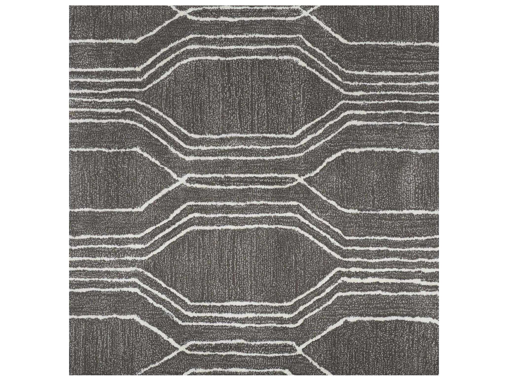 elongated hexagonal shapes within the negative space of the dark Grey background. Handtufted with wool and viscose, this Raimor is incredibly soft and has a beautiful sheen that adds