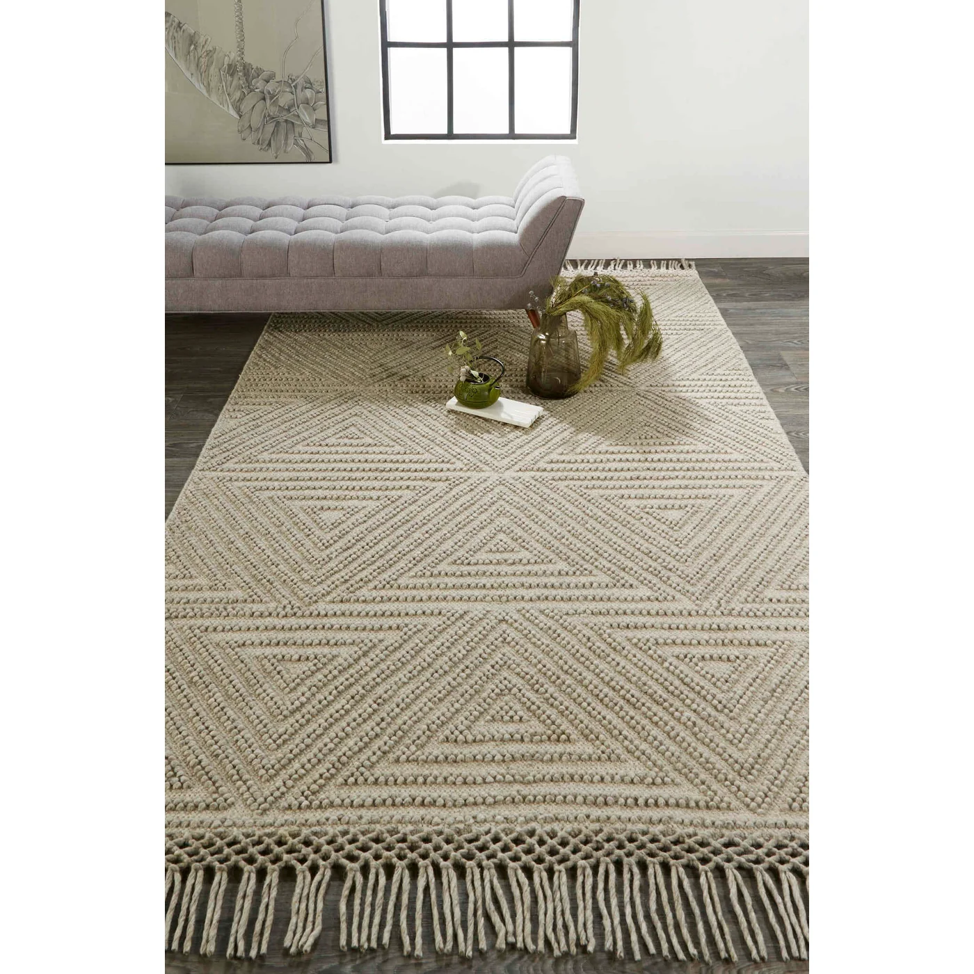 Inky charcoal warm beige and inviting ivory create an approachable neutral palette in the Phoenix Collection. Handwoven of wool and cotton these tonal flatweaves feature easy-to-decorate with geometric motifs that seamlessly integrate into transitional and contemporary spaces alike with alluring textures that add intrigue. Do you have a question about the Feizy Phoenix Geometric 0810F Beige Area Rug? Call us now at 1-800-368-2621.