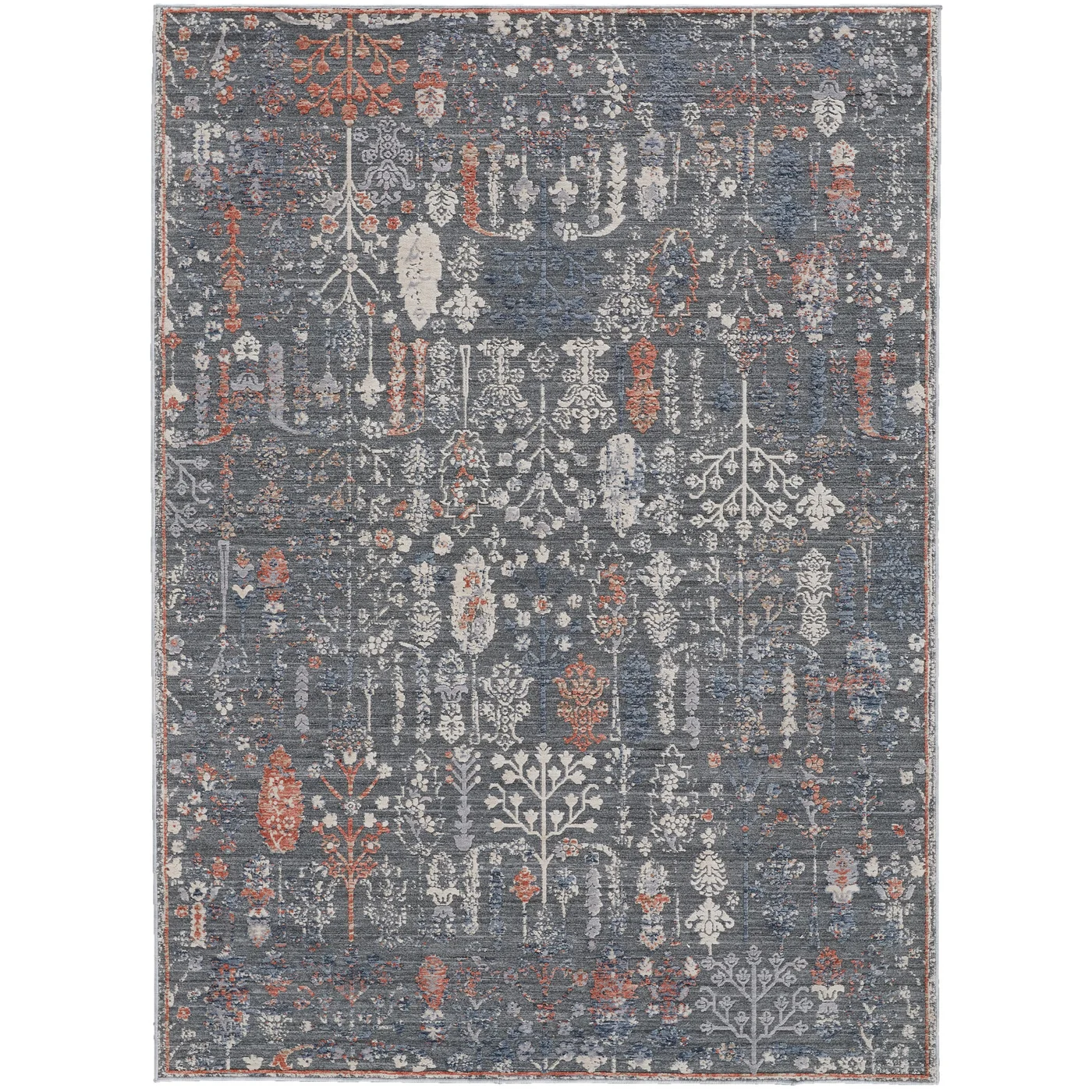 The Thackery Collection embodies the belief that imperfections are beautiful. Unlike the precision and uniformity of other machine woven rugs, this collection imitates the more natural appearance of oriental craftsmanship. Thackery’s high-low texture as well as the color variation within its hand-spun yarn, known as abrash, are both characteristic of hand-crafted rugs. Presented in soft motifs with hints of rust and blue against a charcoal background, this perfectly imperfect collection feels effortlessly sophisticated. Do you have a question about the Feizy Thackery Ornamental 39D1F Grey Area Rug? Call us now at 1-800-368-2621.