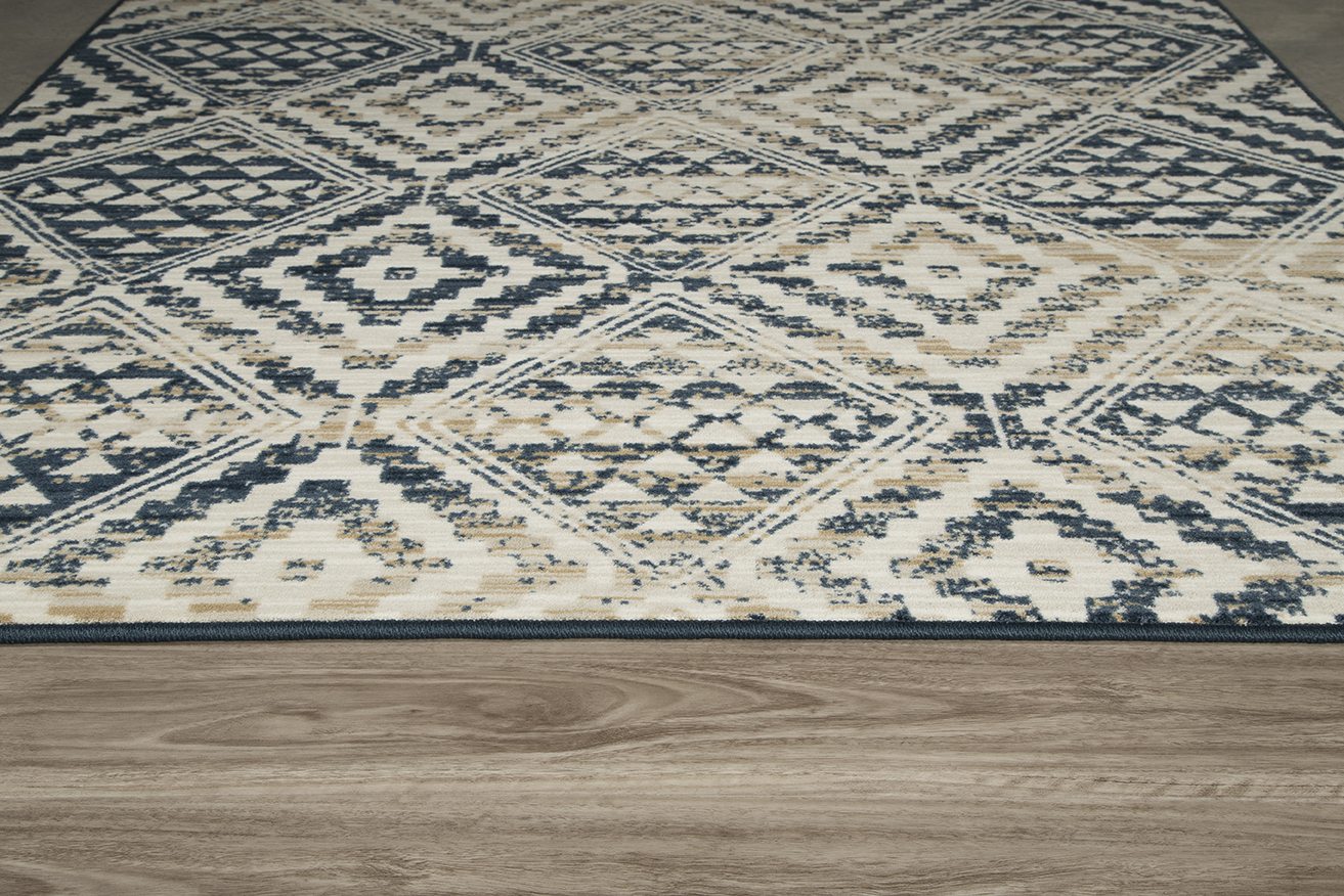 This Kenten Artisan Blue diamond pattern from the Drayton Collection is an artful pairing of fine multicolored striations and a traditional motif. This rug’s vintage appeal is made in the shifts in shade and contrast in colors which enhance the appeal of the Kenton design in any home. This Collection explores a shared community and sense of place. This rug is inspired by the raw materials of a small textile community and their time worn face. Organic subtlety morphs with geometric clarity to shape our perspective through a historical lens. A lens of community. A lens of heritage. This elegant rug provides the perfect amount of home accent and unrivaled style, while being extremely soft, durable and responsibly made. The creamy neutral coloring in this rug creates the overall timeless and sophisticated tone that, when mixed with the geometric design develops a one of a kind experience for your home. With Milliken rugs you not only get original, creative designs, but you always get one of a kind service and a true dedication to your satisfaction.