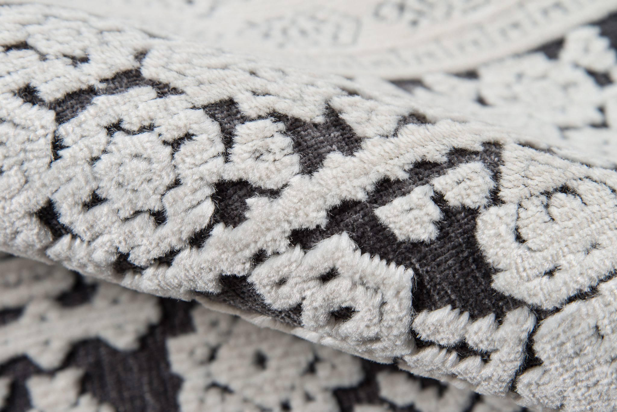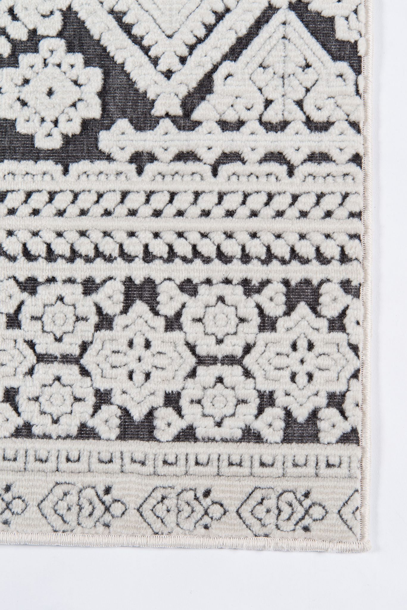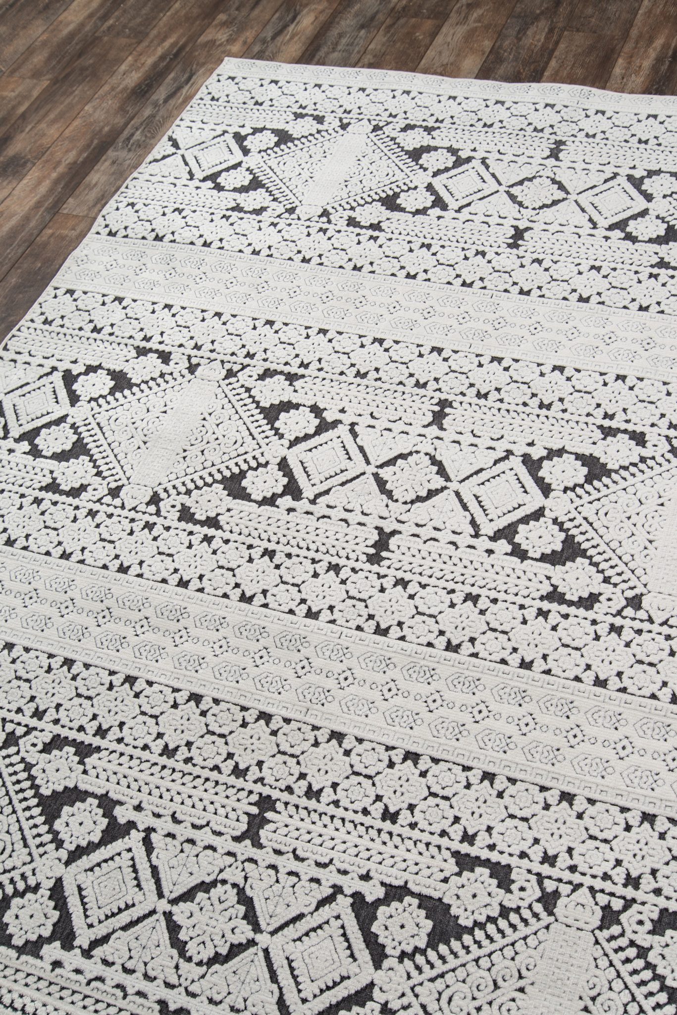 Graphic ethnic motifs fill this indoor area rug collection with standout styles to stand upon. From geometric tribal designs to scrolling French filigree, the exotic rug assortment offers multiple options for accessorizing interior floors. A blend of synthetic and soft chenille fibers lends a sculptural quality to each decorative floorcovering, using depth and dimension to define the edges of every intricate pattern.