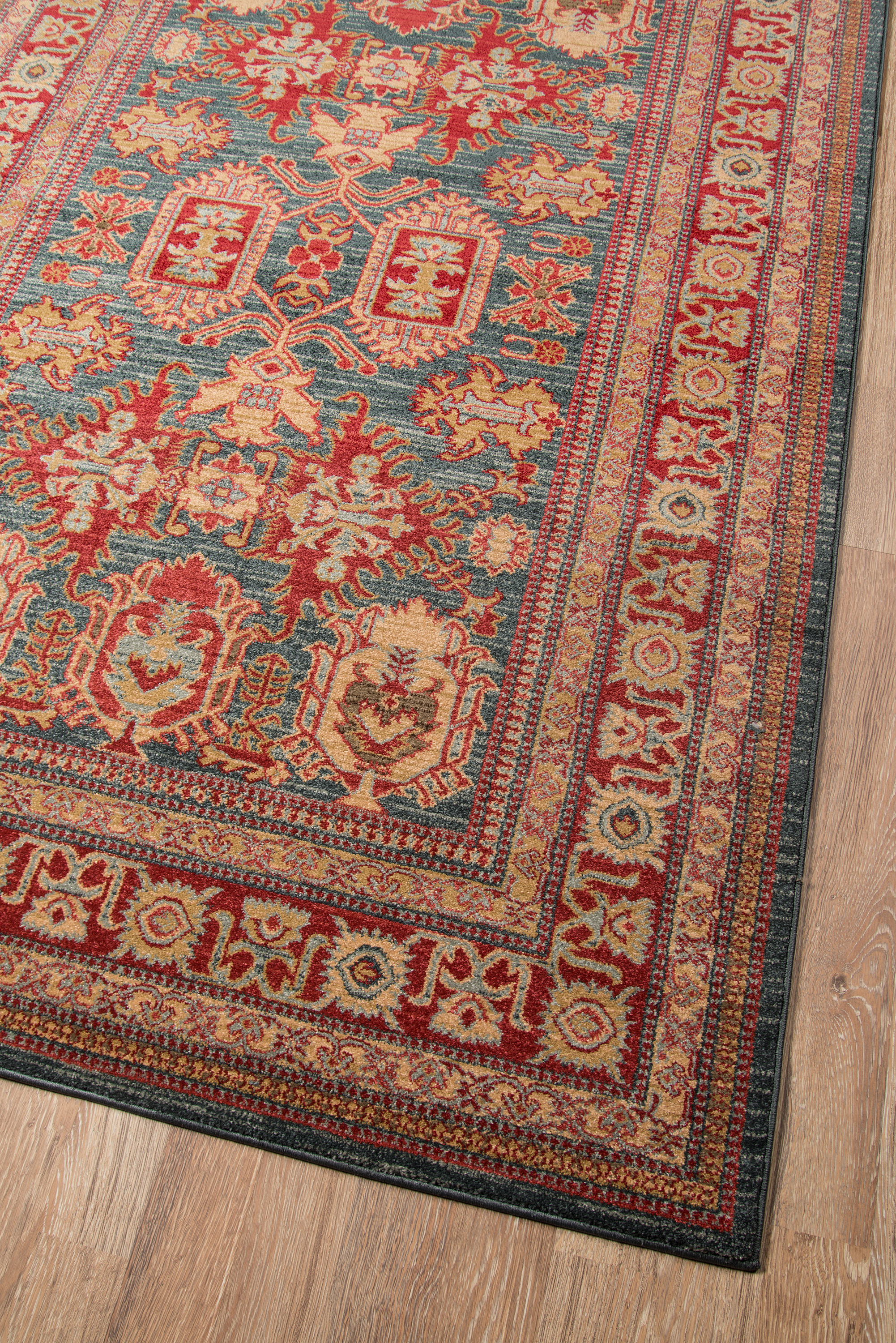 The ornamental elegance of this traditional area rug has deep roots in old world design motifs. Evoking the timeless visual elements inspired by classic Kazak carpets, an eye-catching geometric field of medallions, palmettes and flowers is surrounded by an intricate border in regal shades of crimson red, blue and gold. With references to centuries-old Heriz and Serapi rug patterns, each elaborate rug design is elegantly crafted from soft synthetic fibers, while power-loomed precision ensures this traditional floorcovering will truly stand the test of time.