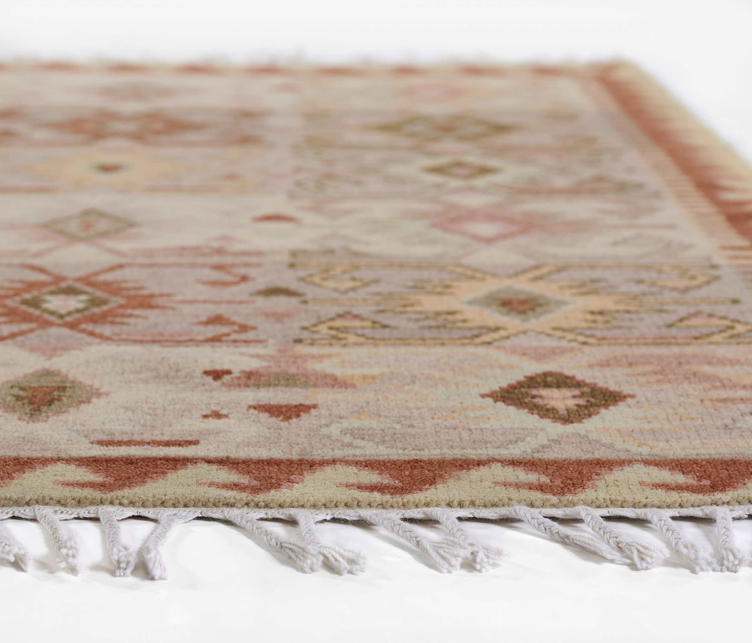 The tribal design of the Nomad captures the essence of boho chic. Inspired by ancestral area rug motifs, traditional diamond and dot symbols fill the ornamental field and decorative border with a repeating geometric pattern in a vivid color palette. Each rug is embellished with tassels of fringe that enhance the assortment’s global elements. Hand knotted from 100% natural wool fibers, the free-spirited style looks luxe when placed as a featured floorcovering at the center of the room or layered in a casual arrangement beneath coffee tables and chairs.