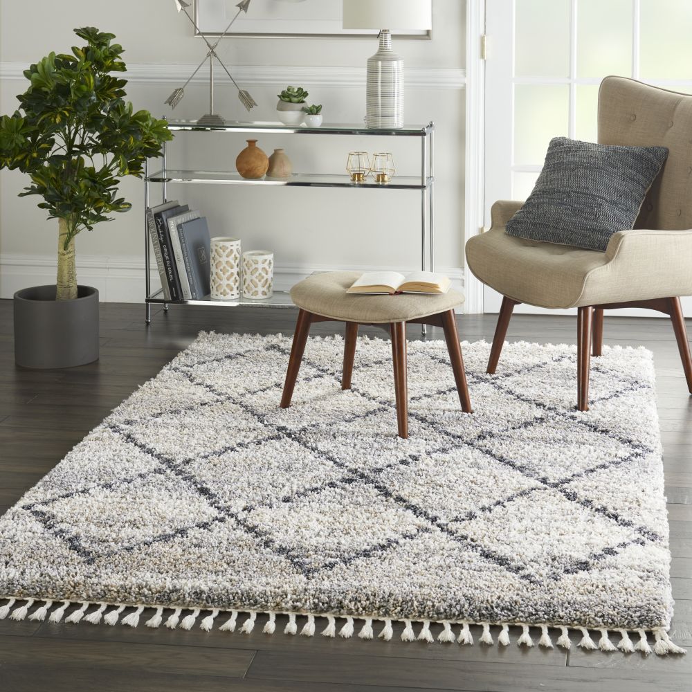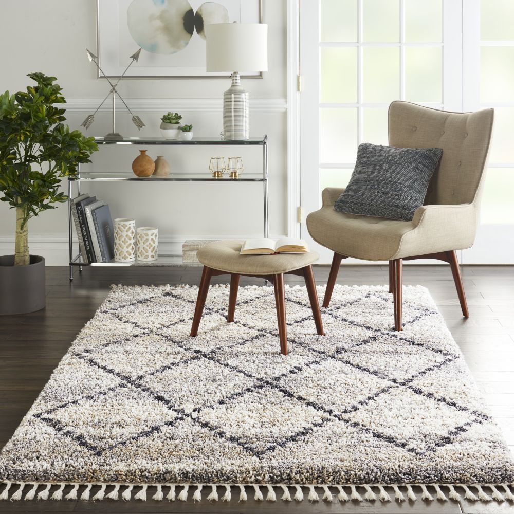 With contemporary hues and clean lines, Nourison's Oslo Collection reflects a Scandinavian influence in these plush shag rugs. These thick, inviting rugs feature easy-care fibers with twisted fringe finish for an authentic tribal look and feel, featuring lattice and diamond designs in rich greys and soothing neutral colors. Each rug adds a layer of warmth and welcome to any space in your home.